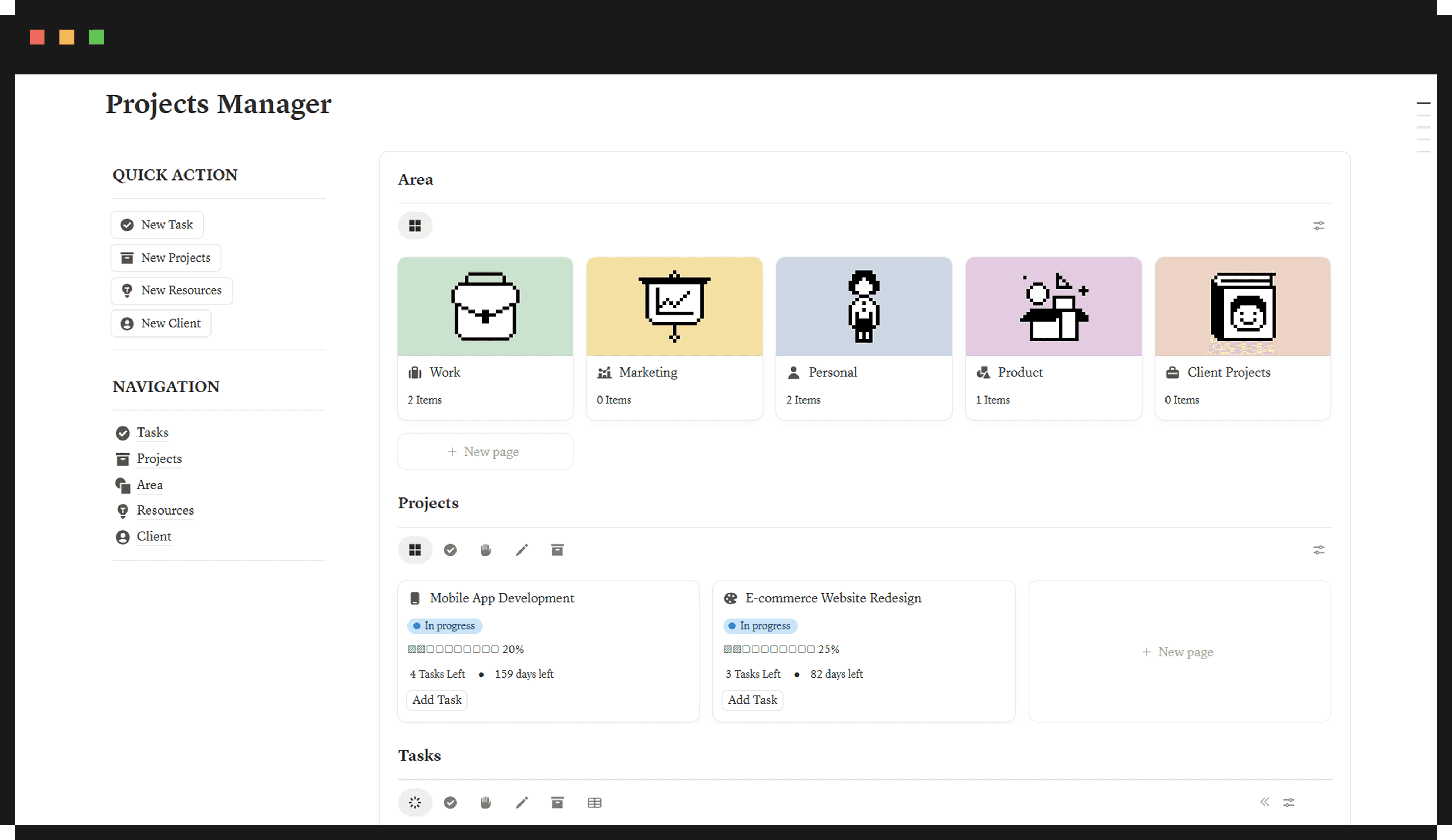 Projects Manager helps you organize tasks, projects, and client work in one Notion workspace. Track deadlines, manage progress, and keep everything connected with a clear, structured system designed for efficient daily workflow.