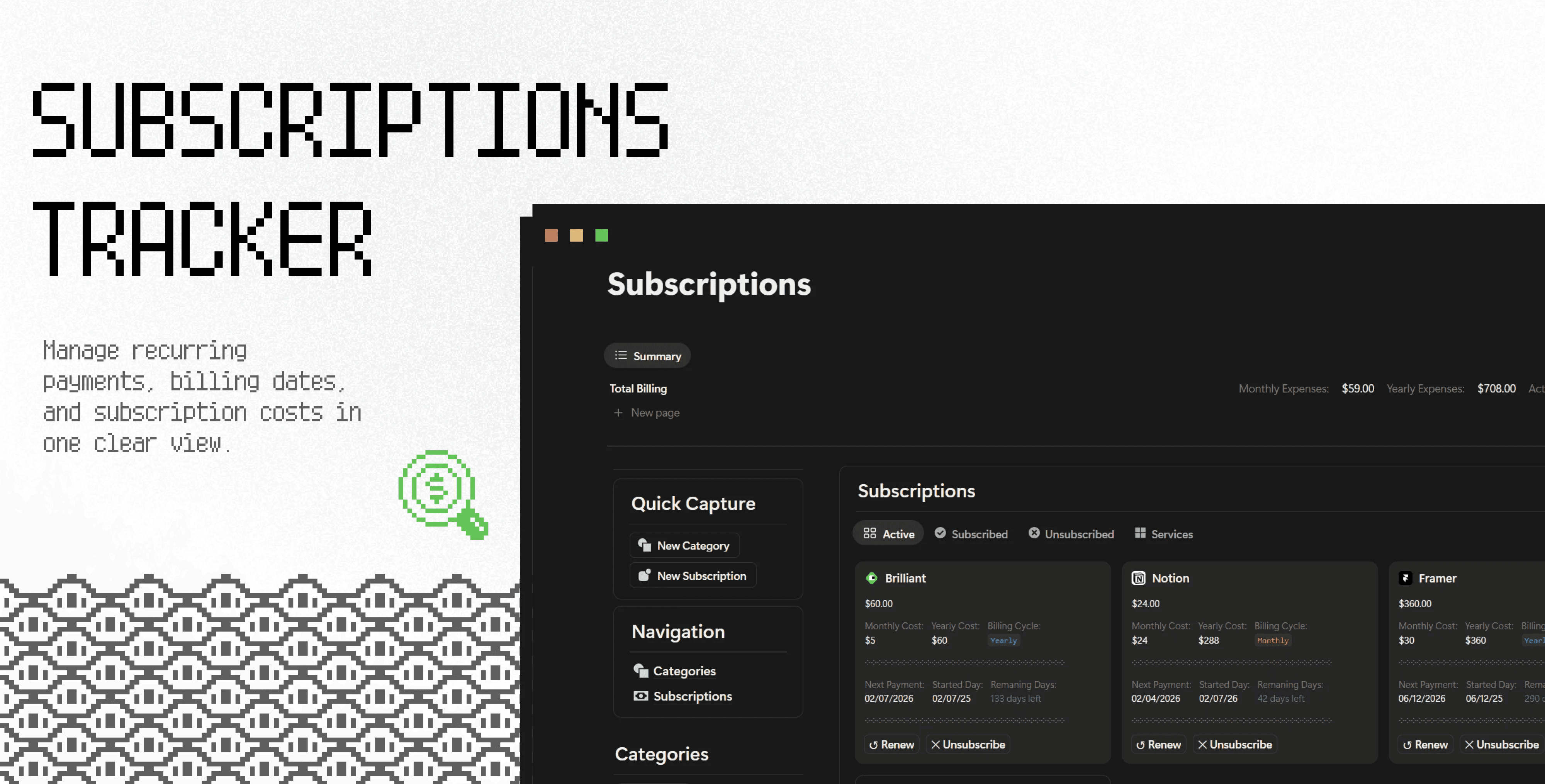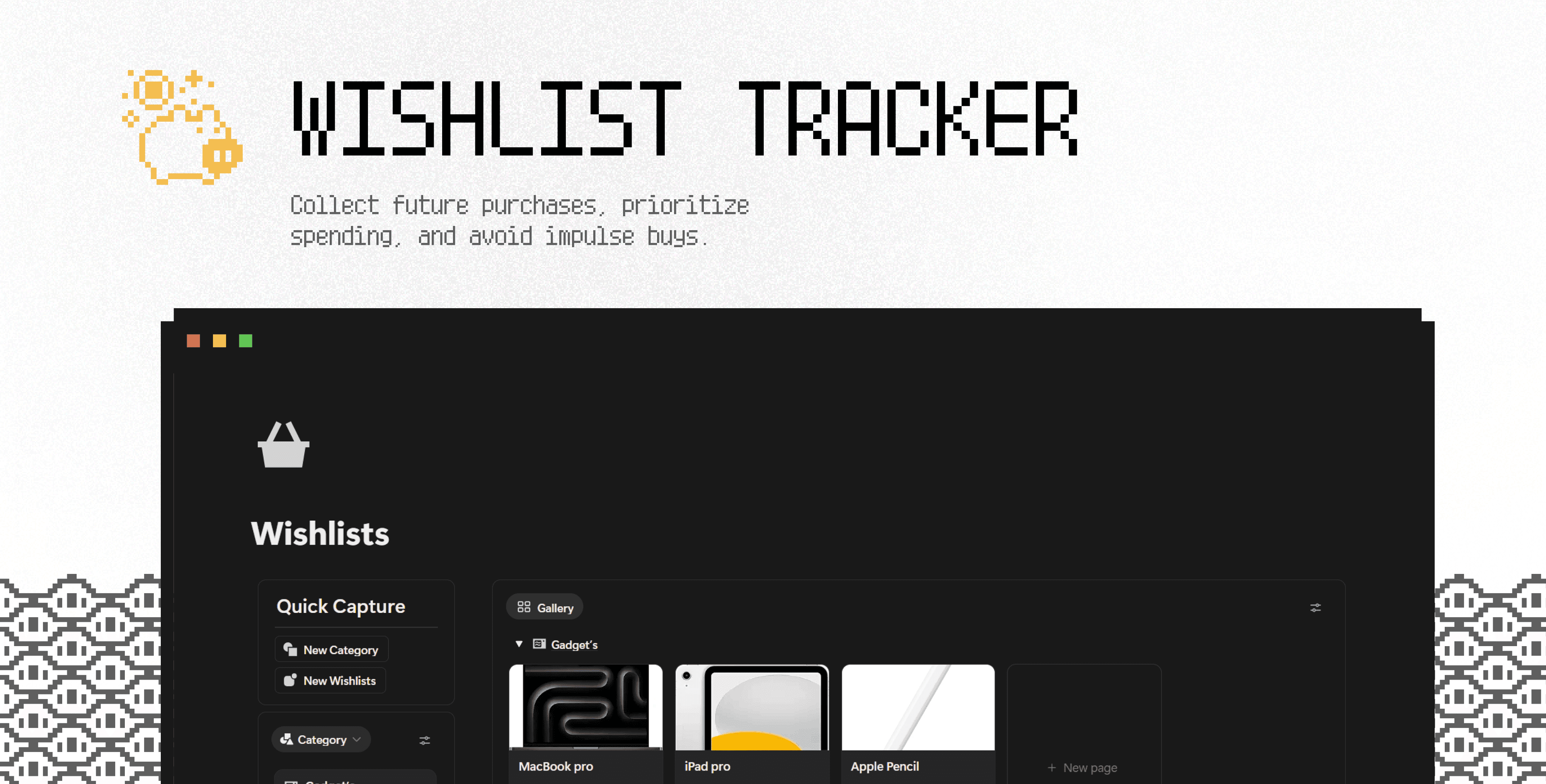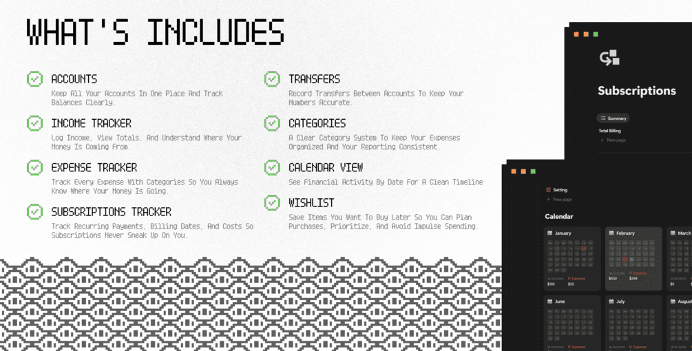 Finance Tracker is a complete Notion system for managing personal finances with clarity and control. Track income, expenses, transfers, and balances across multiple accounts while reviewing your finances through monthly and calendar views. Built-in subscription and wishlist tools help you plan ahead and avoid impulse spending.